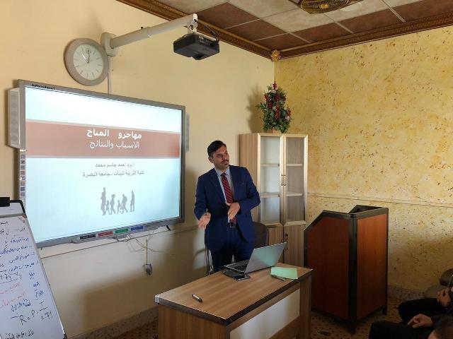 The College of Education for Women at University of Basrah held a seminar on "Climate Immigrants: Causes and Consequences", in the presence of a number of researchers. The seminar aimed to present the impact of climate changes on forced migration of the inhabitants in the countries of the world. Dr. Ahmed Jasim discussed the role of global climate changes in causing human migrations as a result of the changes in weather conditions such as storms, hurricanes, floods and droughts which lead to the deterioration of natural environmental resources and the expansion of migration. Thus, the number of immigrants increased and is expected to reach (2) billion people by the year 2100 A. D.